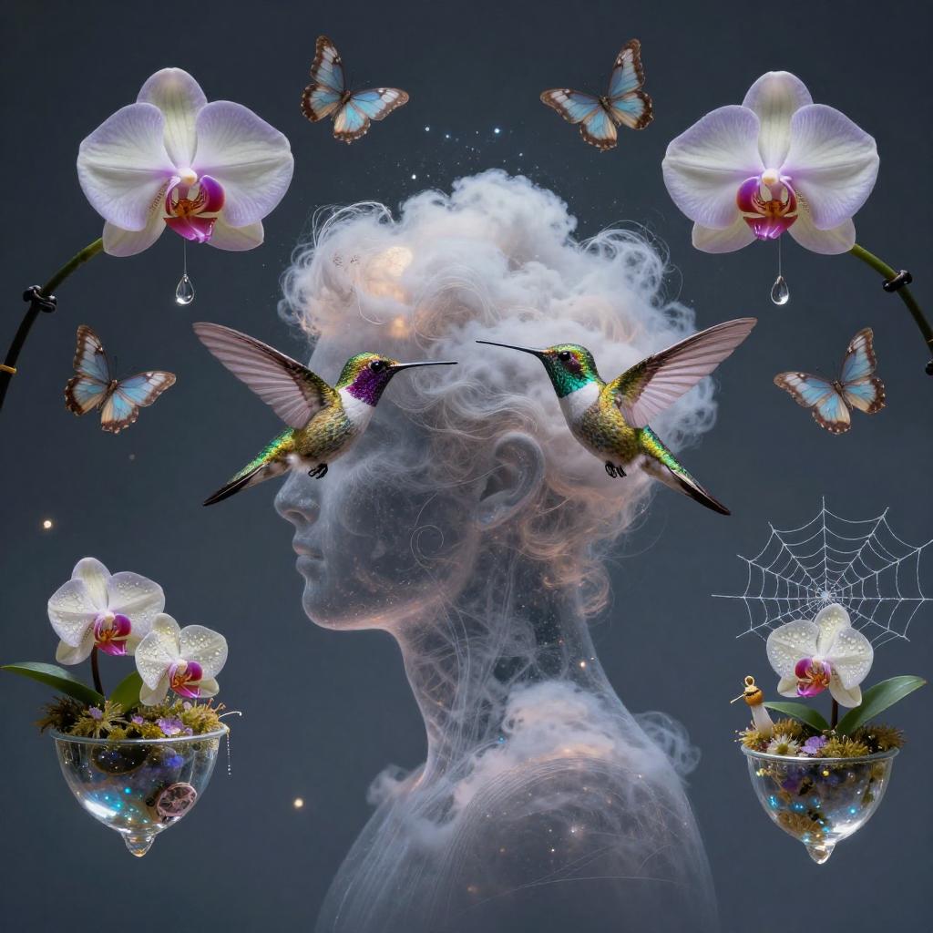 Realistic photo. Double Exposure Hummingbird-Dream, iridescent orchids and floating nectar droplets, clockwork butterflies, bioluminescent pollen motes, miniature glass floating isles with dew-laden blossoms, moonlit spiderwebs of light, whimsical fantasy, expressive creative art, surrealistic concept art, ethereal landscape in a cloud of magic coming out the top of a human head, incredible details, high-quality, flawless composition, masterpiece, highly detailed, photorealistic, 8k sharp focus quality surroundings realistic photo