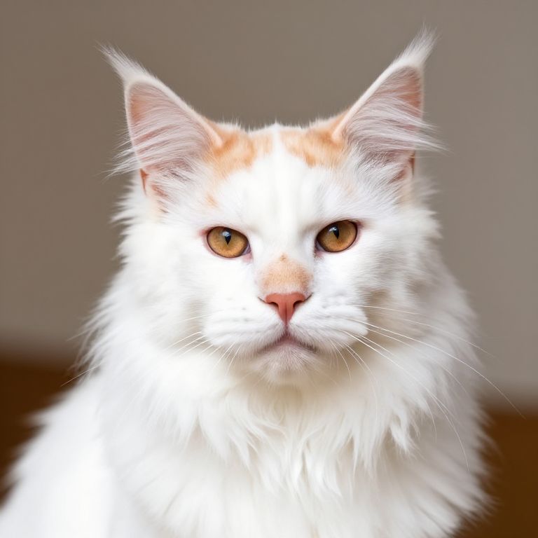 Close-up portrait of a white and orange Maine Coon cat with luxurious long fur, intense gaze, and tufted ears, studio lighting emphasizing its regal features against a soft, blurred background.