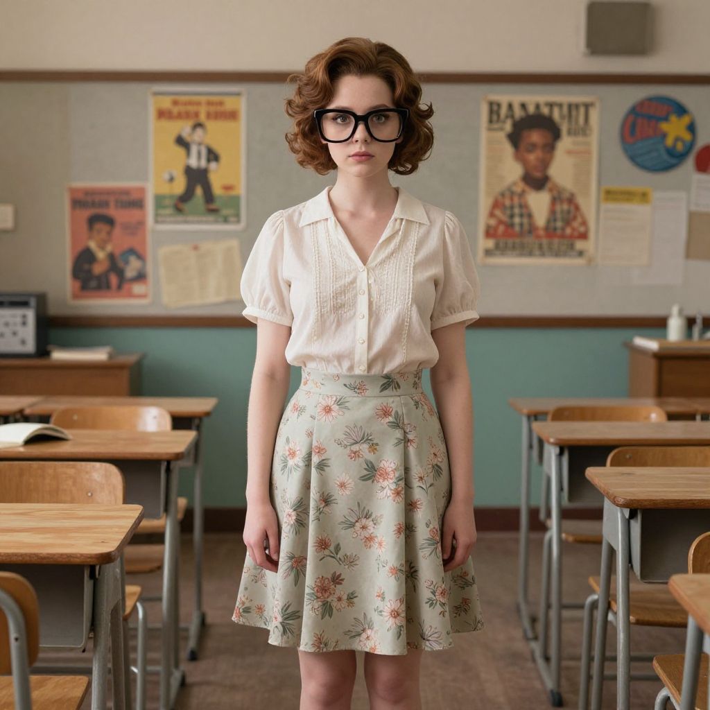 Deb costume inspired by Napoleon Dynamite, featuring a modest floral skirt, a tucked-in blouse, oversized glasses, and a shy stance, set against a backdrop of a quirky, small-town high school classroom with vintage posters, rendered with a nostalgic, light-hearted atmosphere.