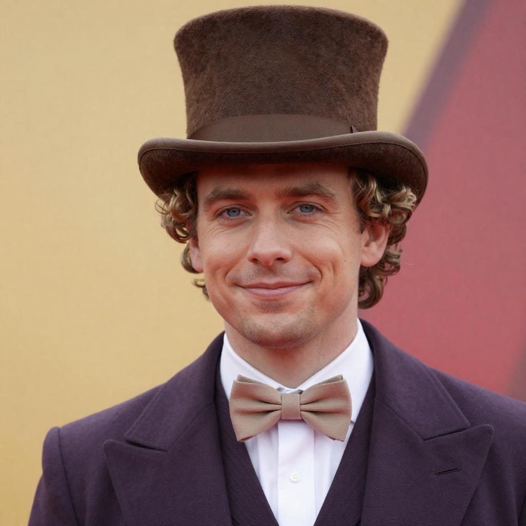 Photograph of a man with curly pink hair, wearing a tall brown top hat, purple velvet jacket, light blue bow tie, and white shirt. He stands with hands clasped, facing right. A person with dark hair, white hat, and brown jacket is partially visible on the left. Dark background with warm lighting.
