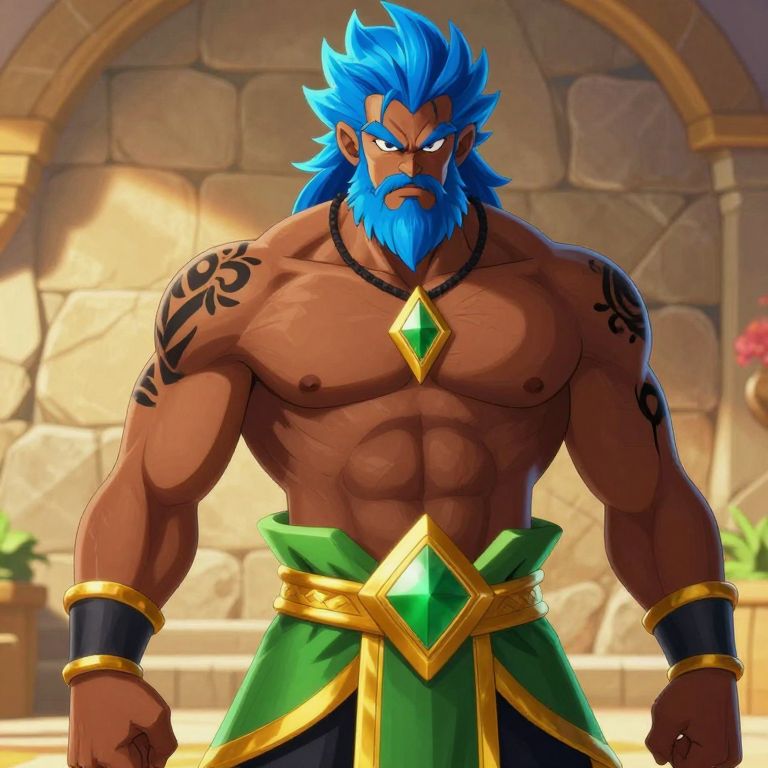This is a vibrant, digital artwork of a muscular, dark-skinned male character with wild, bright blue hair and a matching beard. He has pointed ears, a stern expression, and a tattoo on his upper left arm. He's shirtless, wearing a green and gold loincloth with a large, diamond-shaped gold pendant in the center. He also has black wristbands. The background features a stone wall.