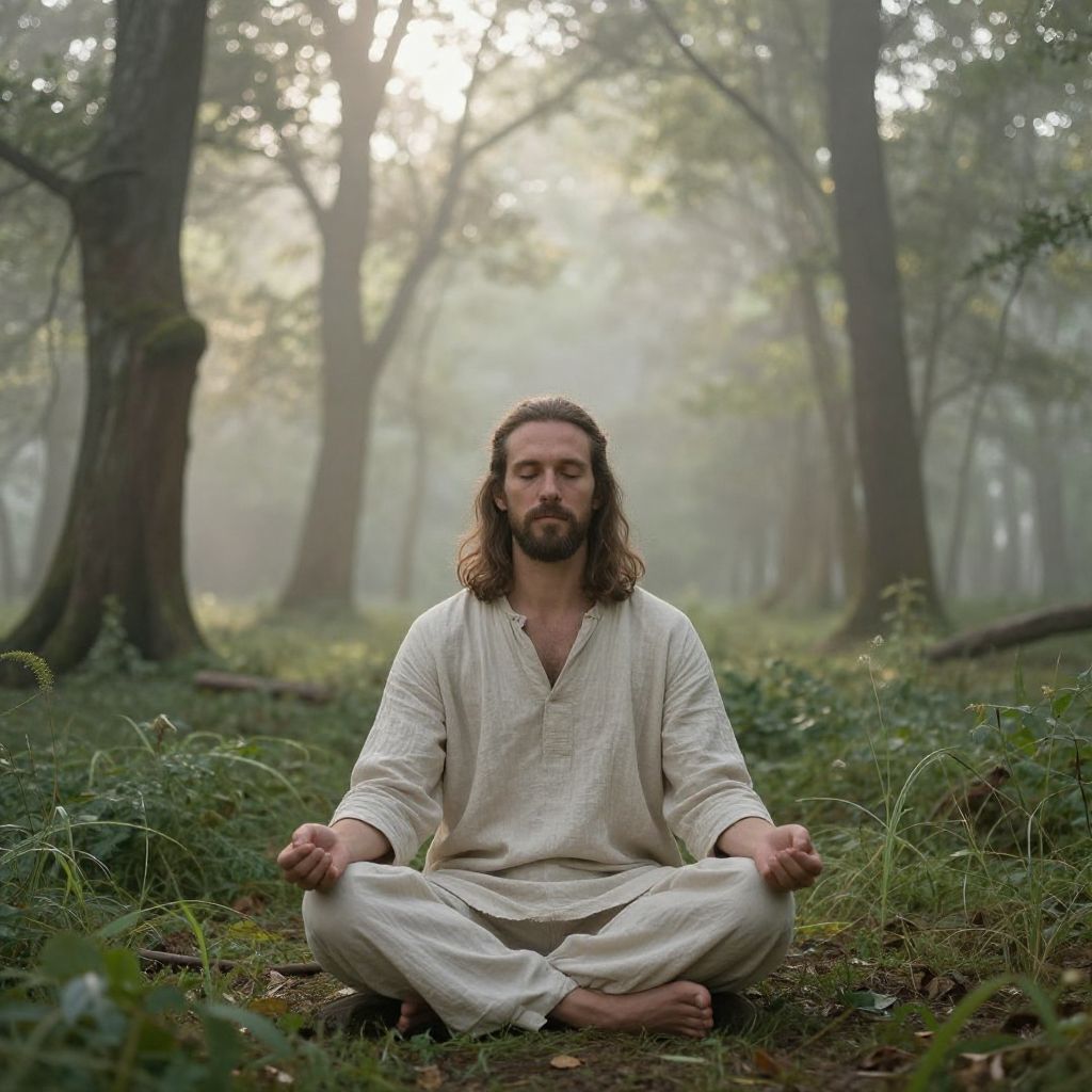 Photograph of a bearded man with long brown hair, wearing a white linen tunic, meditating cross-legged in a misty forest.