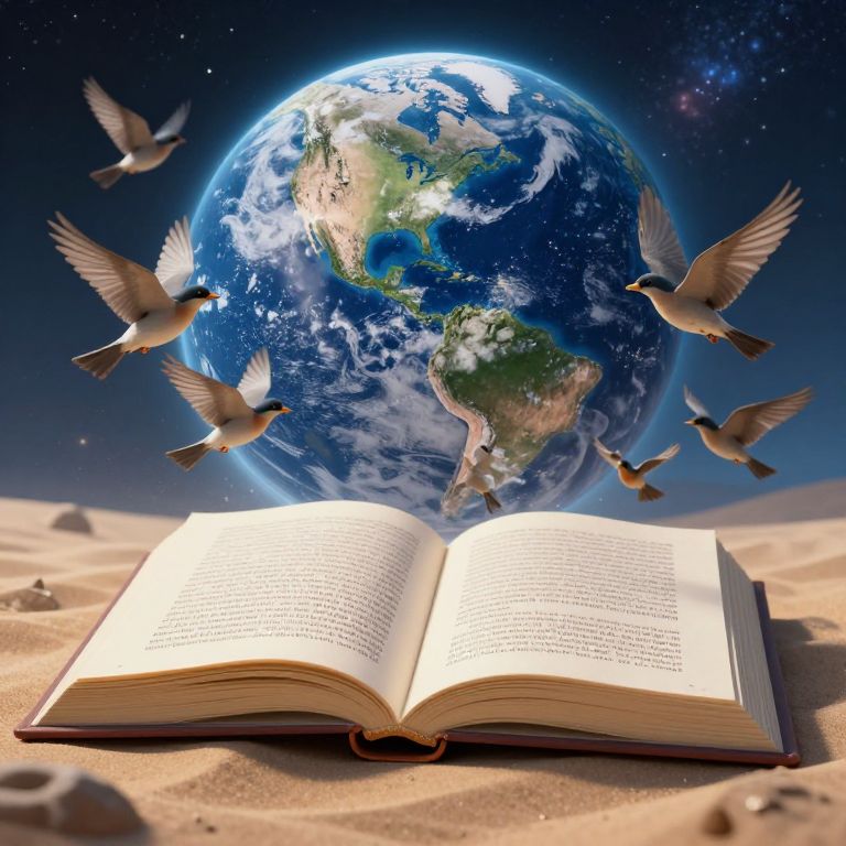 A surreal digital artwork depicts an open book on a sandy surface, its pages alive with fluttering birds that seem to emerge from the text, symbolizing the narration of stories against the backdrop of Earth, rendered in high-definition detail with a cosmic, dreamlike aesthetic.