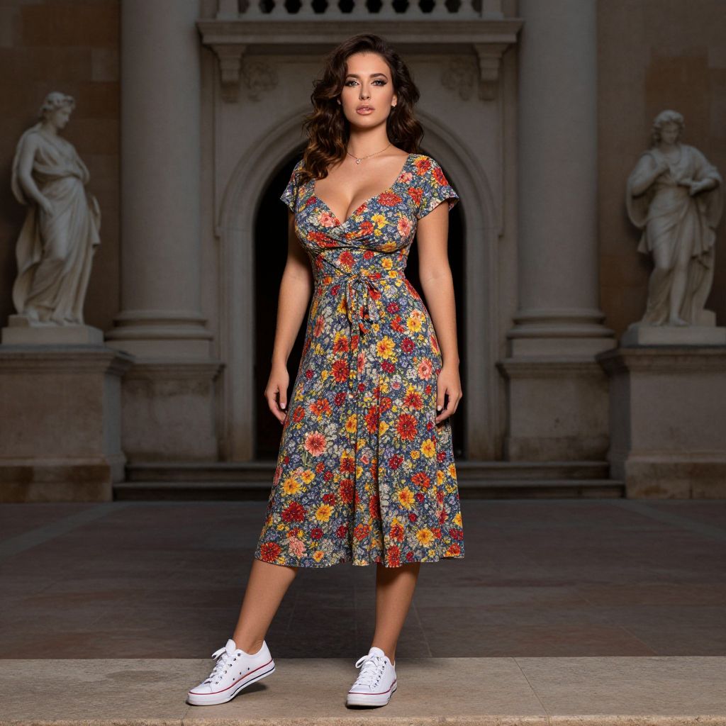 Photograph of a curvy woman with long dark hair, wearing a colorful floral dress and white sneakers, standing in front of classical statues in a grand