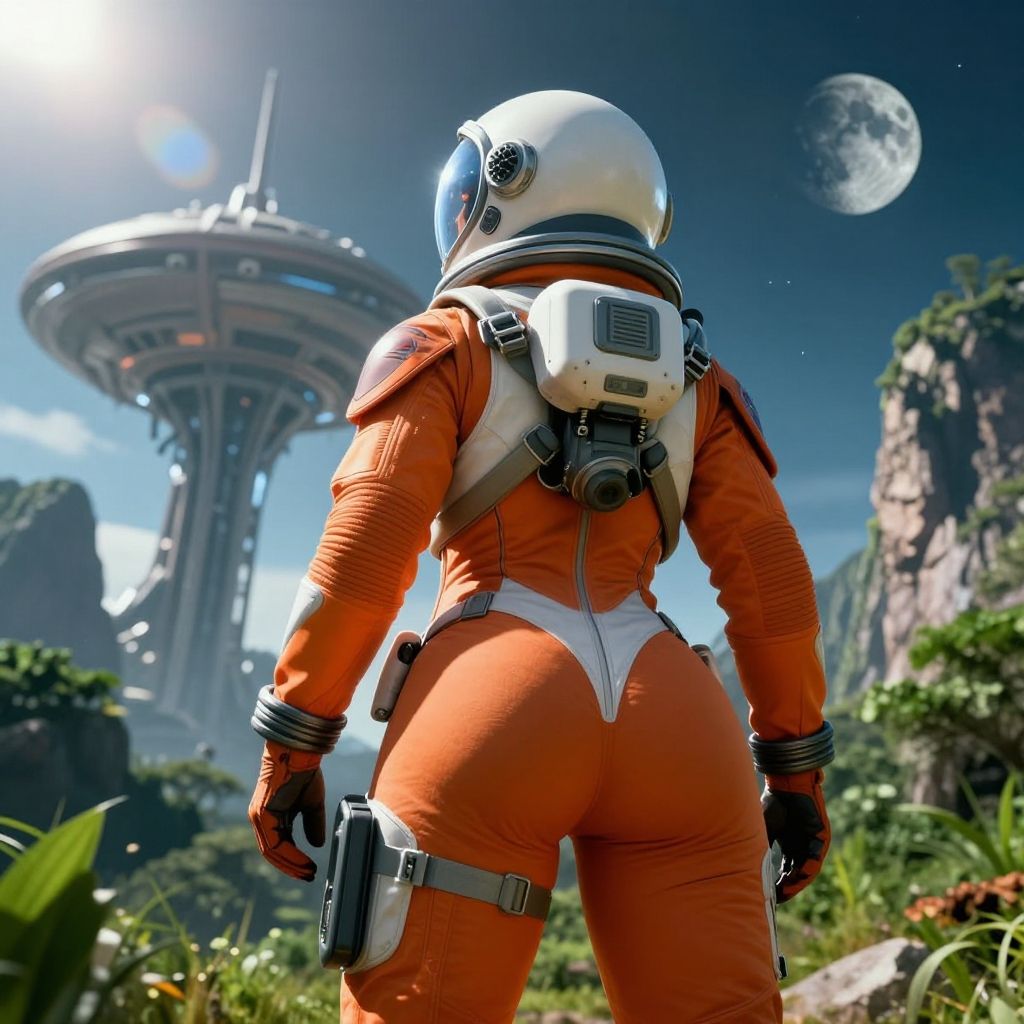 Rear angle, Highly detailed RAW color Photo, Rear Angle, Full Body, of (female space soldier, wearing orange and white space suit, helmet, tined face shield, rebreather, accentuated booty), outdoors, (looking up at advanced alien structure, on alien planet), toned body, big butt, (sci-fi), (mountains:1.1), (lush green vegetation), (two moons in sky:0.8), (highly detailed, hyperdetailed, intricate), ((DAY TIME)), (lens flare:0.7), (bloom:0.7), particle effects, raytracing, cinematic lighting, shallow depth of field, photographed on a Sony a9 II, 50mm wide angle lens, sharp focus, cinematic film still from Gravity 2013, from behind, cameltoe, close-up