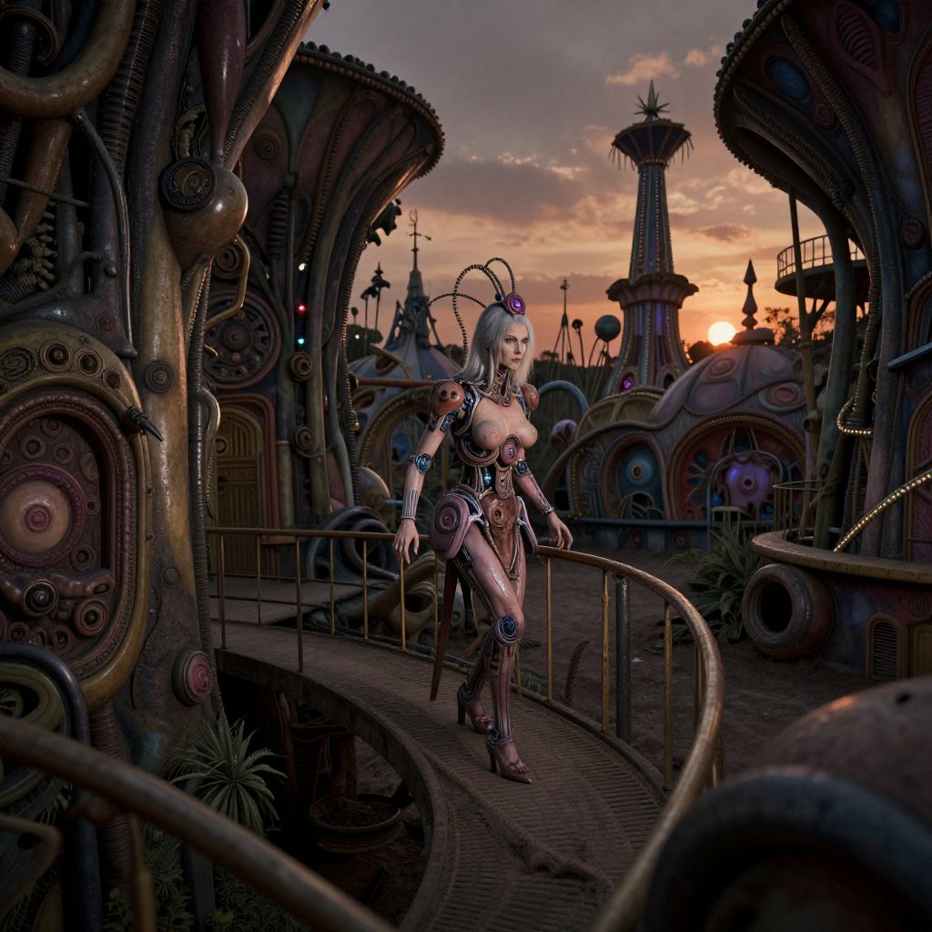 Craft an image characterized by H.R. Giger-esque biomechanical artistry, portraying a surreal 'bug's-eye perspective' of a futuristic amusement park bathed in the eerie glow of nightfall. The scene should showcase grotesquely organic forms entwined with metallic machinery, casting unsettling shadows across the landscape. Amidst this alien environment, observe a solitary female figure, reminiscent of a circus performer, as she navigates her way through the labyrinthine structures adorned in a costume that seamlessly blends human flesh with mechanical elements. This enigmatic character instills feelings of curiosity and apprehension as she glides soundlessly against the backdrop of the darkened amusement park, where the fusion of nature and technology crafts an unsettling yet mesmerizing panorama.
