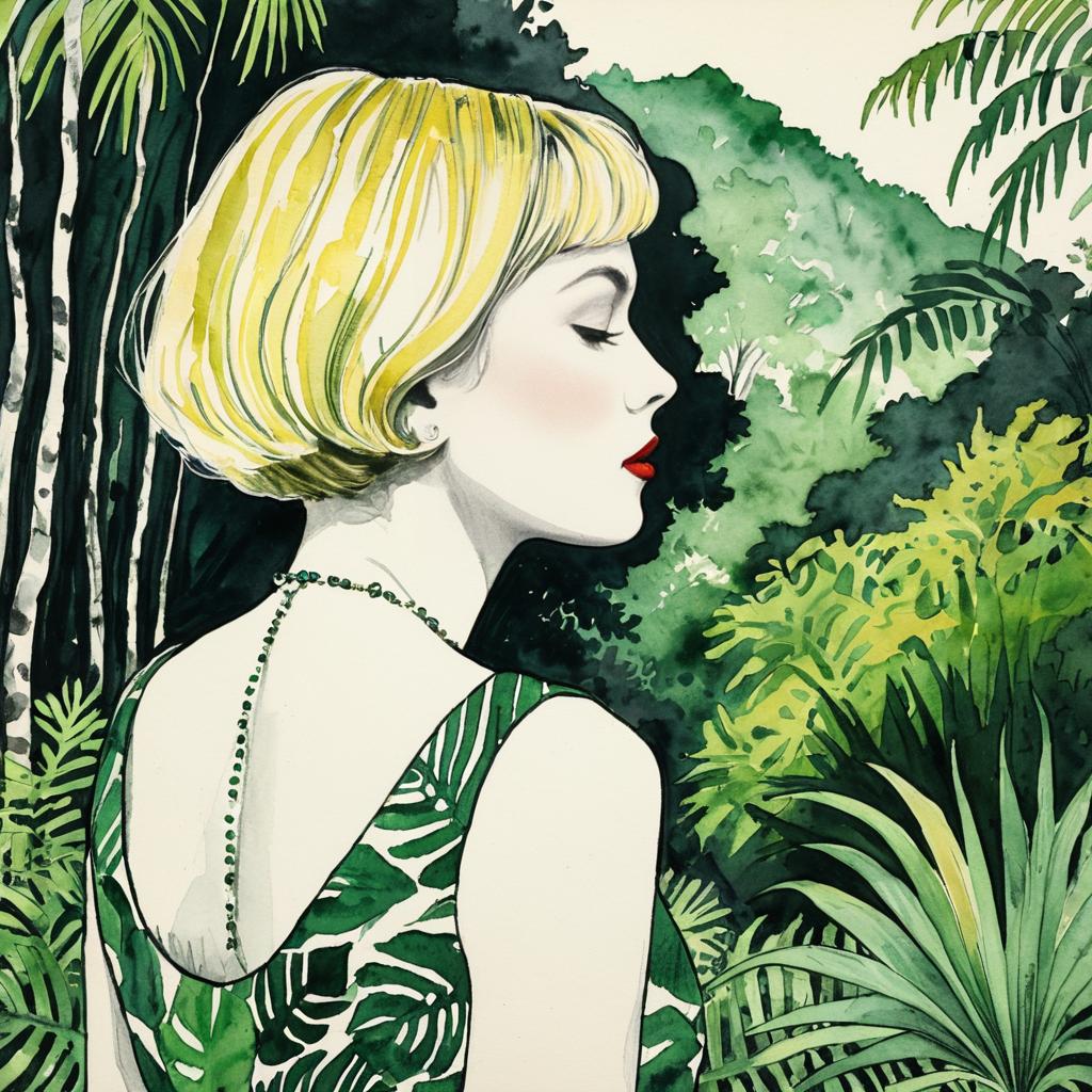 Kees van Dongen, style Charcoal lines sketch: A surreal watercolor painting of a contemplative woman with short blonde hair, merged with a vibrant lush green tropical forest landscape. Her profile creates the illusion of a hillside with trees, where the foliage forms the pattern of her leaf patterned dress, blending seamlessly into a scenic natural backdrop.