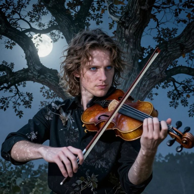 A captivating double exposure portrait captures a charismatic musician with piercing blue eyes and tousled hair, their figure seamlessly merging with the intricate pattern of an ancient oak tree's gnarled branches beneath the moonlight. As they play their antique violin, music fills the air, casting a soft glow on the strings that illuminates the deep shadows between leaves. This ethereal scene evokes a sense of longing and nostalgia, drawing viewers into its haunting beauty.