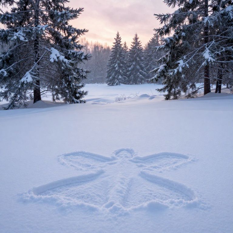 Snow angel images depicting a serene winter landscape, with delicate snow angels imprinted on fresh, glistening snow under soft twilight, framed by frosted pine trees and a gentle snowfall, evoking peaceful, magical winter moments.