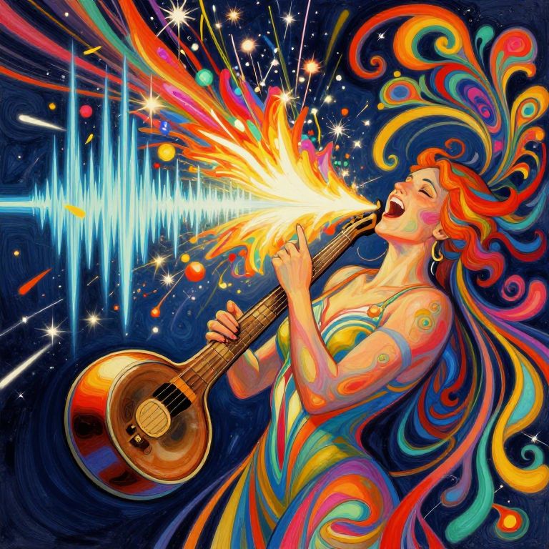 This vibrant digital artwork depicts a female musician with flowing, multicolored hair playing an acoustic guitar. She is mid-performance, with a bright, fiery burst of light and color exploding from her mouth, resembling a magical or energetic effect. Her dress is a swirling mix of rainbow hues, complementing the dynamic background filled with neon lines, stars, and a blue soundwave. Her skin is adorned with colorful, swirling patterns. Her eyes are closed in ecstasy, and her mouth is open wide, adding to the sense of powerful expression. The guitar has a wooden texture, and the entire scene is filled with energy and movement.