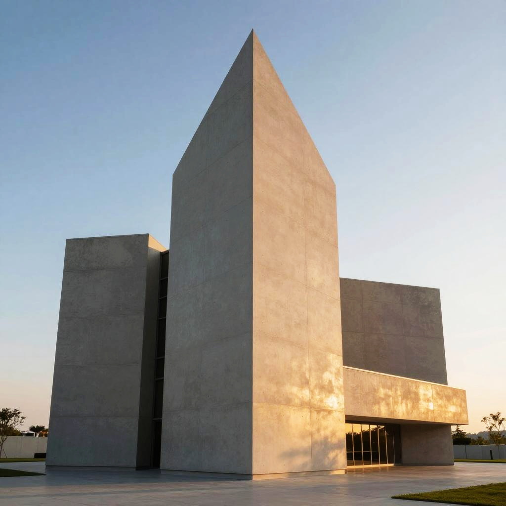 Modern church exterior featuring sharp geometric shapes and concrete materials, illuminated by warm golden hour sunlight, serene atmosphere, ultra-realistic rendering
