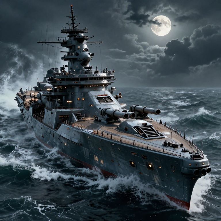 Battleship concept art depicting a massive futuristic warship sailing through stormy seas, intricate armor plating reflecting moonlight, powerful cannons ready for battle, dark moody atmosphere, sci-fi details, dynamic composition with crashing waves, cinematic lighting.