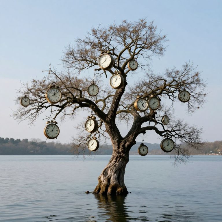 A surreal tree emerges from the tranquil waters of a lake, its gnarled branches adorned with an array of clocks, each ticking and chiming in a harmonious yet enigmatic dance of time.