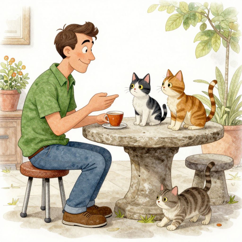 A cartoonish scene featuring a man in a green shirt and blue jeans sitting on a stool, engaged in a conversation with two cats on a stone table, with a detailed, watercolor-painted background.