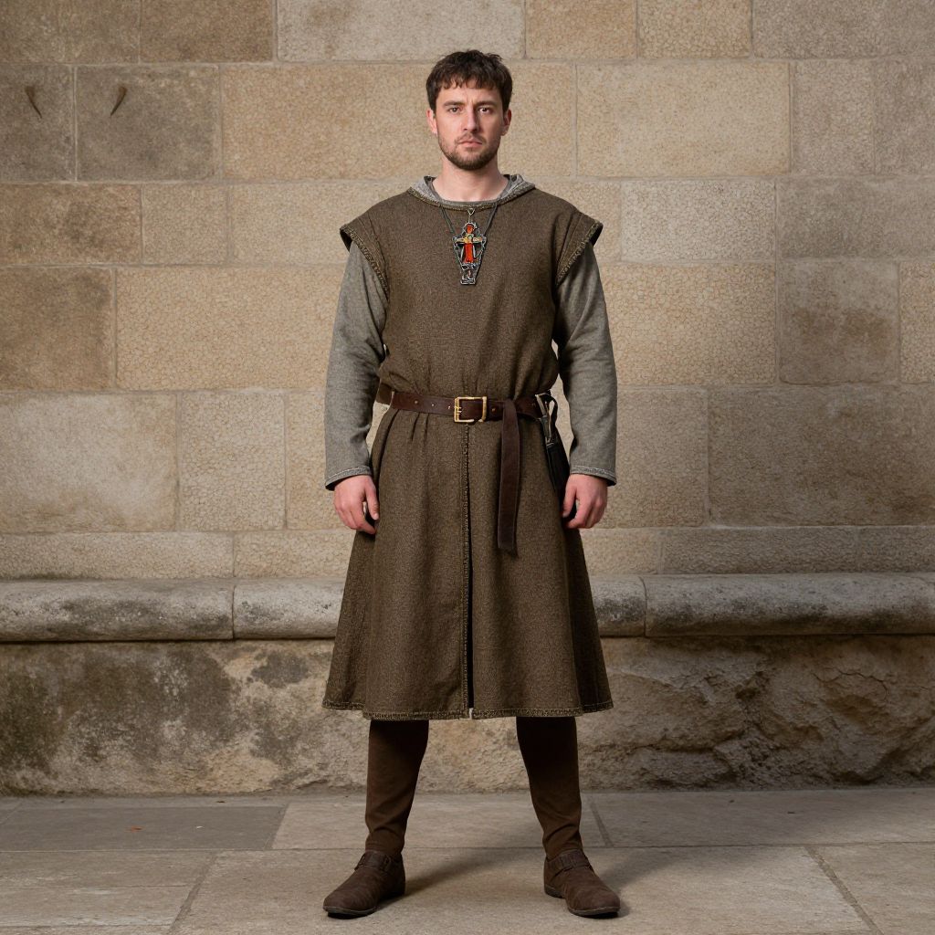 Photograph of a bearded man in medieval attire, wearing a brown tunic, gray shirt, belt, and boots, standing in front of a