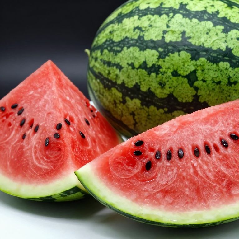 Photograph of vibrant watermelon slices with black seeds, bright red interior, and green rind, next to a whole watermelon. Dark background highlights