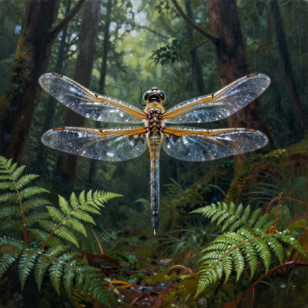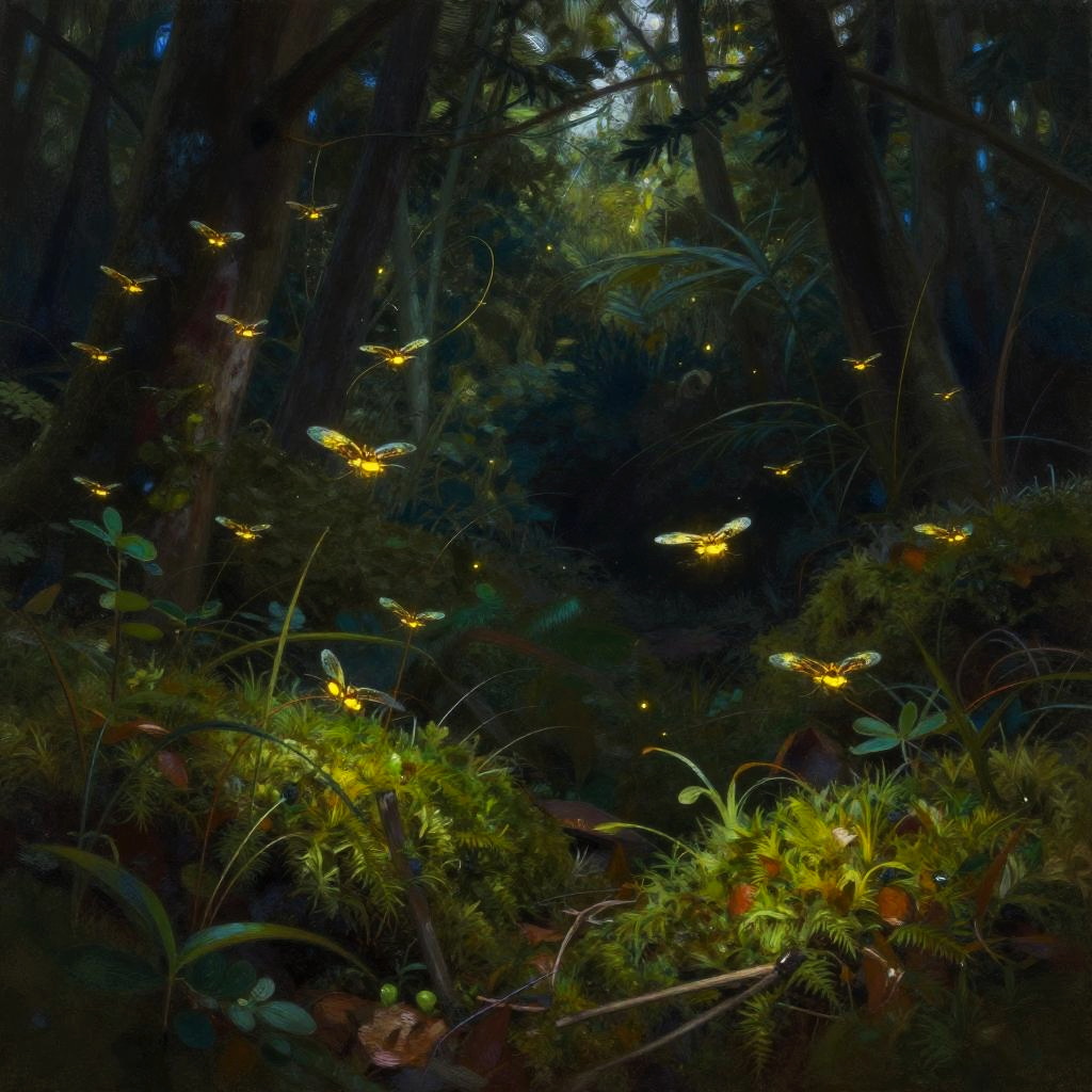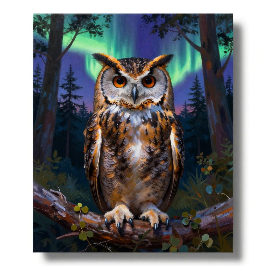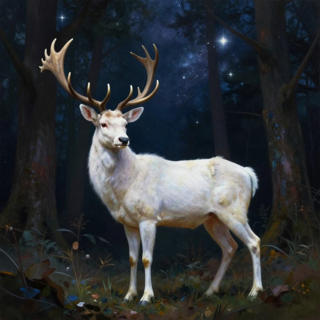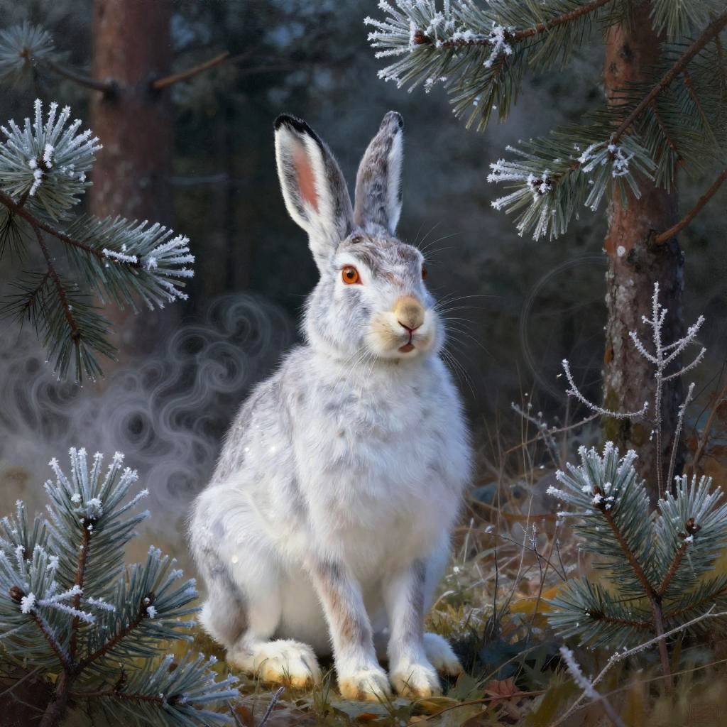 A painted composition featuring a radiant snow hare in a symmetrical forest scene, with frost-laden pine boughs and swirling mist and volumetric lighting. The style is in the vein of Dan Mumford and Marc Simonetti, blending astrophotography elements with rich, deep colors and ultra-detailed brushwork.