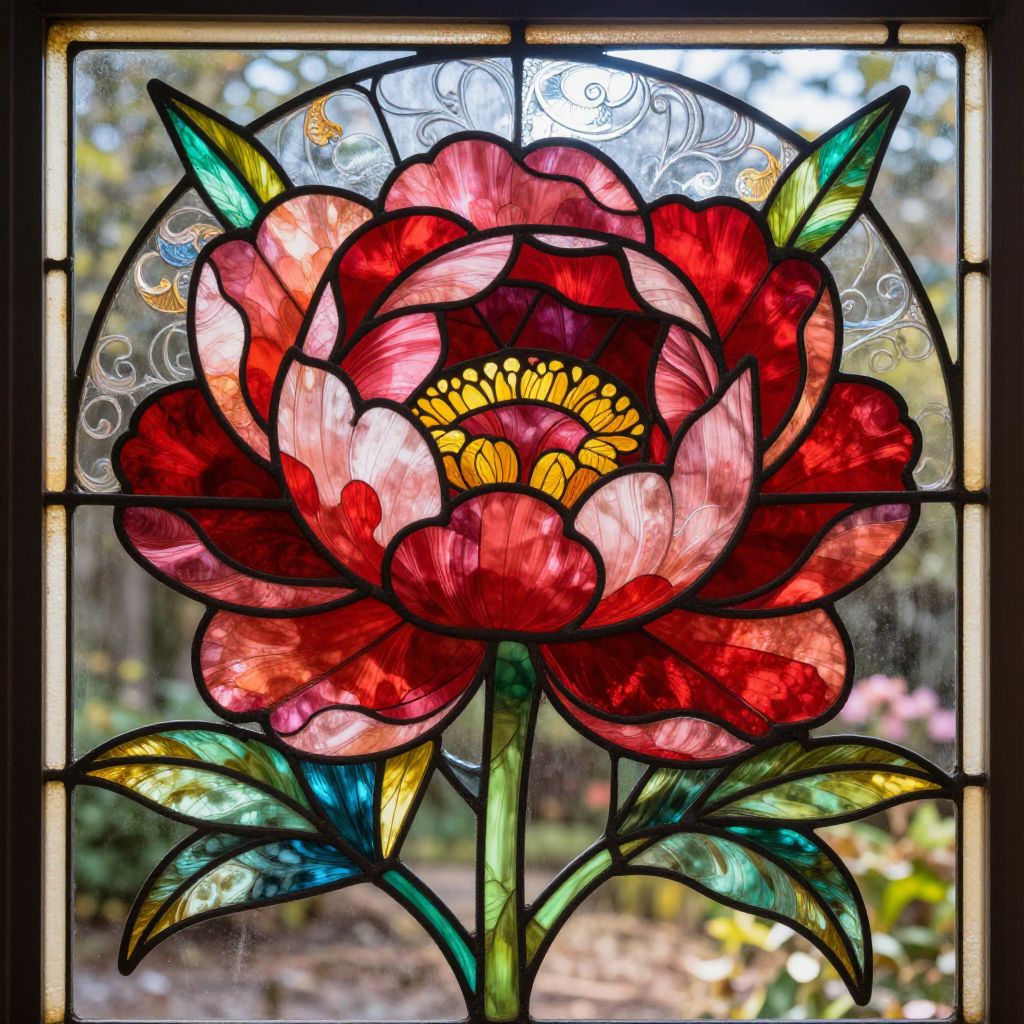 Stained glass peony in vibrant colors, sunlight streaming through with detailed leaded lines, intricate floral pattern, elegant curves and rich reds and pinks, set against a softly blurred garden background, art nouveau style