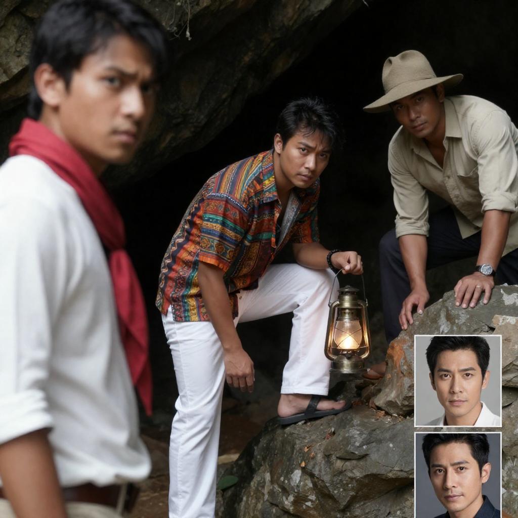 Movie poster. Three men in a dark cave. Left man with dark hair, intense expression, white shirt, red scarf. Center man in colorful patterned shirt, white pants, leaning forward, holding a lantern. Right man in beige shirt, hat, examining a rock. Top left close-up of left man's face. Bottom right actor headshots. Dark cave background.