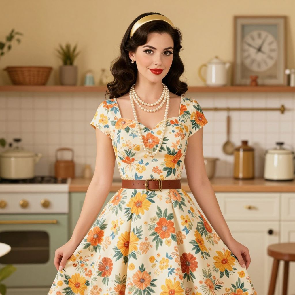A vintage-inspired digital illustration featuring a woman in a retro rockabilly dress adorned with floral patterns, complemented by a pearl necklace and a gold headband, set against a cozy, retro-styled kitchen backdrop with warm lighting and classic decor elements.