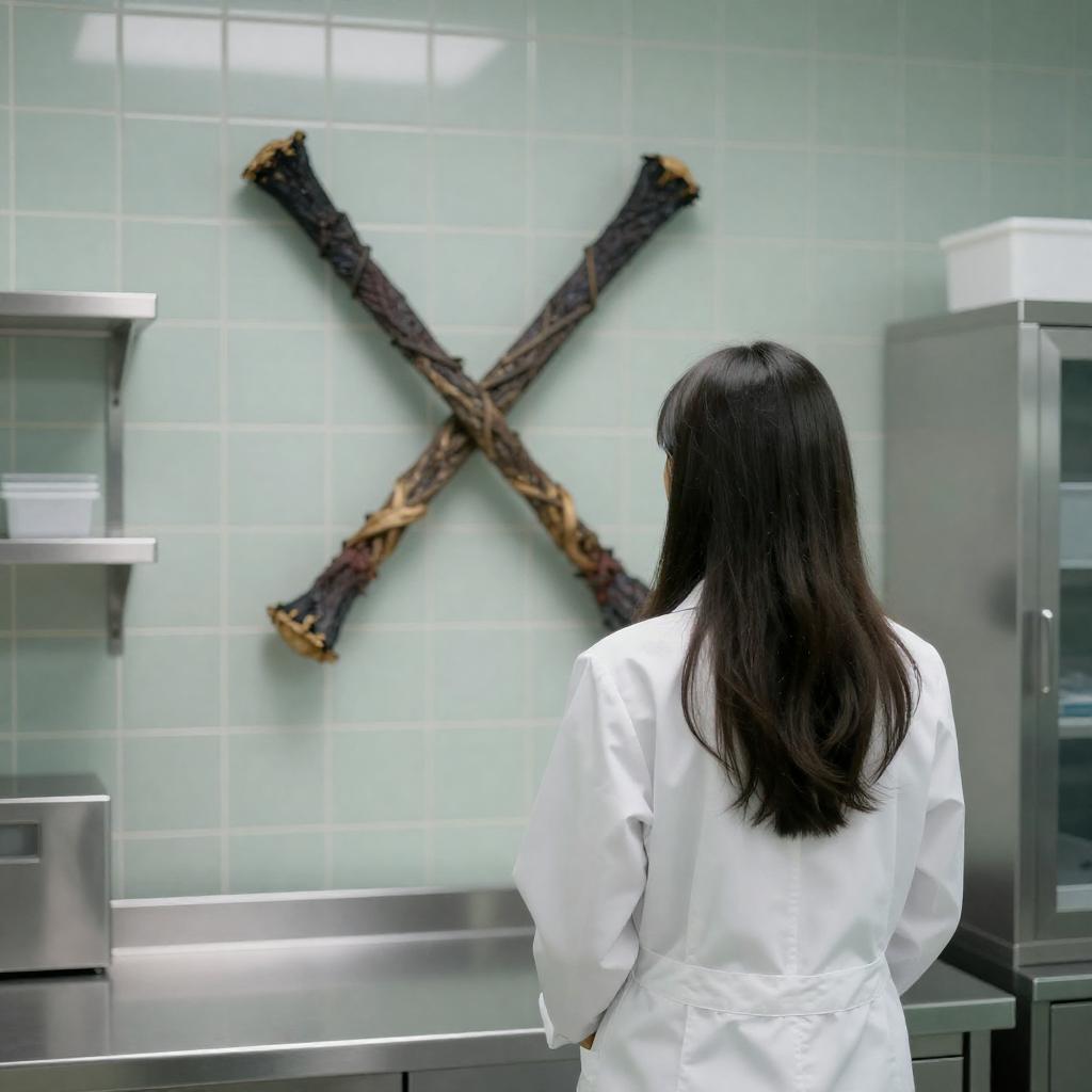 Woman with long dark hair in white lab coat, viewed from behind, stands in sterile kitchen. Two dark, dried, twisted objects crossed on light green tiled wall. Stainless steel equipment, metal shelf, filing cabinet in background.