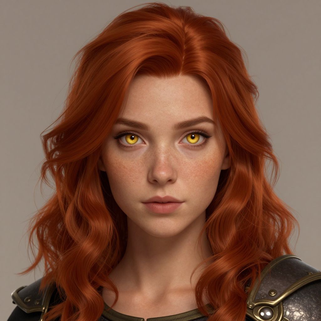 Digital portrait of a freckled, red-haired woman with yellow eyes, wearing dark, armored shoulders, against a neutral gray background.