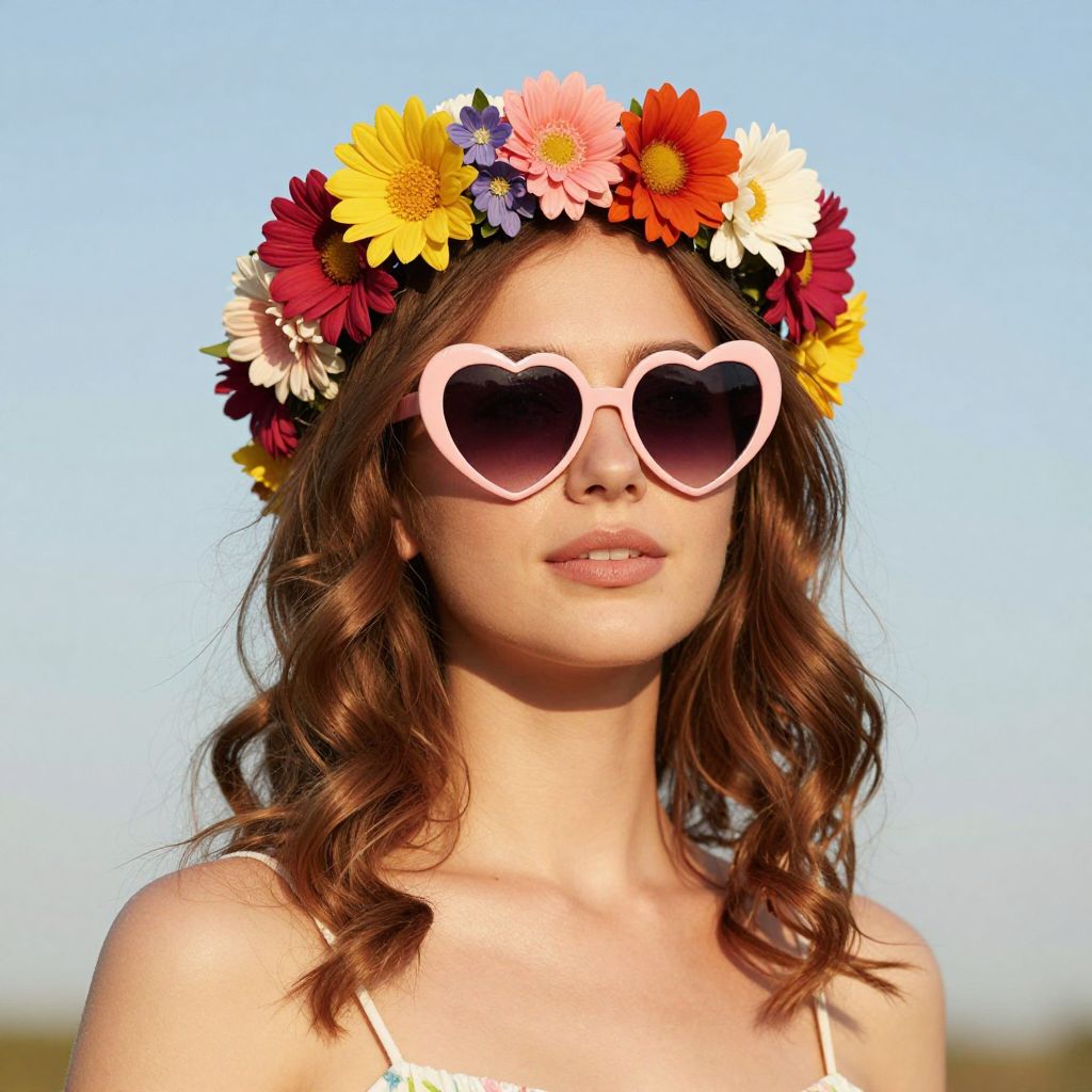Radiant serenity and playful joy intertwine as a woman adorned with a vibrant flower crown and heart-shaped sunglasses embodies the ephemeral beauty of summer, inviting the viewer into a world of warmth, freedom, and timeless elegance.