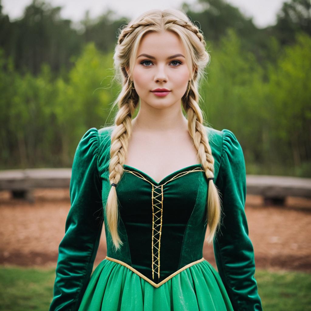 Disney aurora costume,1girl, solo, blonde hair, green dress, braid, dress, long hair, twin braids, looking at viewer, long sleeves, blurry background