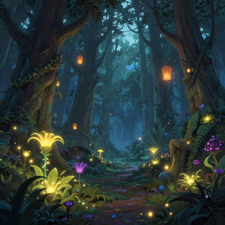 Enchanted forest at night, illuminated by glowing mushrooms, fireflies, and lanterns, with towering trees and a mystical blue ambiance.