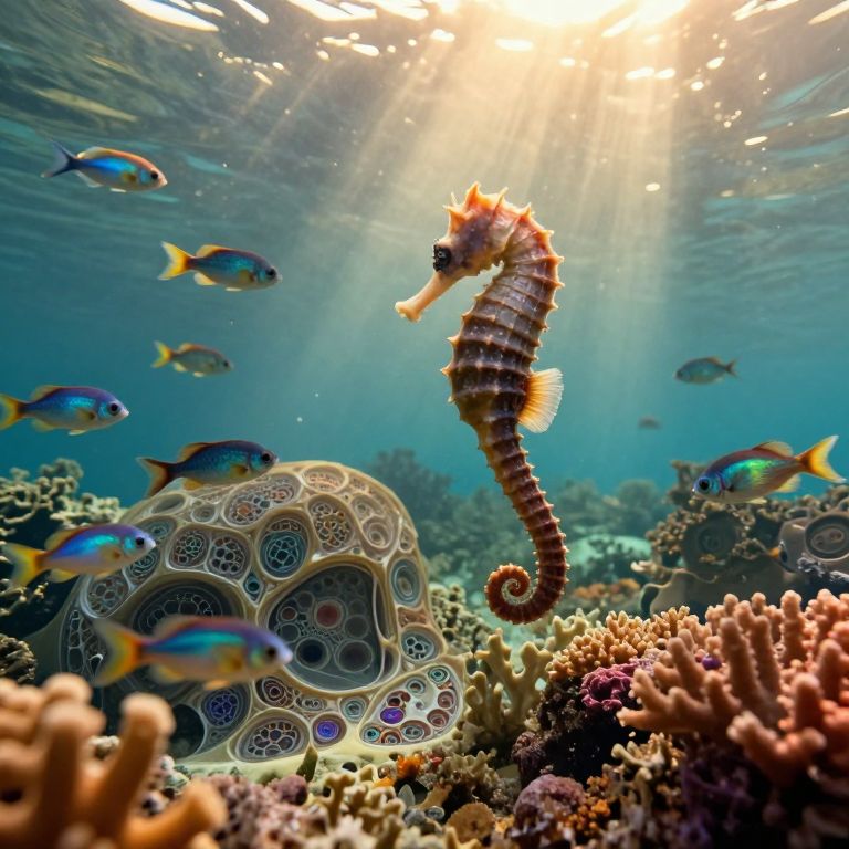 A serene underwater tableau, reminiscent of Haeckel's biomorphic illustrations, depicts a majestic seahorse gracefully drifting through a school of iridescent fish in an intricate coral reef. Swirling patterns evoke the organic cell structures, creating a mesmerizing and ethereal atmosphere. Soft golden rays filter through crystal-clear waters, casting subtle shadows that dance across this tranquil landscape, evoking enchantment and tranquility as one explores this vibrant marine wonderland.