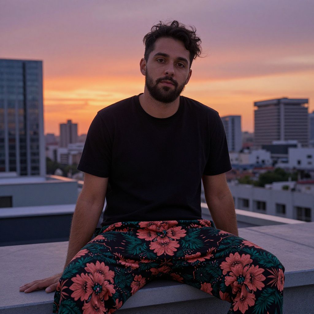 A diverse man with a beard, brown eyes, and a calm expression sits on a rooftop in a city skyline during sunset. He wears black floral pants with rich, symmetrical floral designs in coral and deep green tones. The background shows a modern city with orange and purple skies, a view of tall buildings, and a slight breeze creating a warm, tranquil atmosphere.