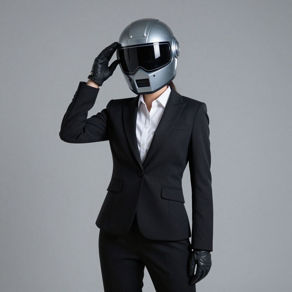 Photograph of a person in a black suit with a white shirt, wearing a silver motorcycle helmet with a black visor, black gloves, and saluting with their right hand. The background is a solid light gray. The suit is well-fitted, and the helmet is shiny, reflecting light. The person's gender is indeterminate due to the helmet and gloves, and they stand centrally, looking directly forward. The image has a modern, minimalist style.