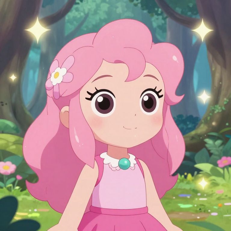 Character pink hair in a whimsical anime style, magical forest setting, sparkling light effects, playful expression, pastel color palette, detailed character design