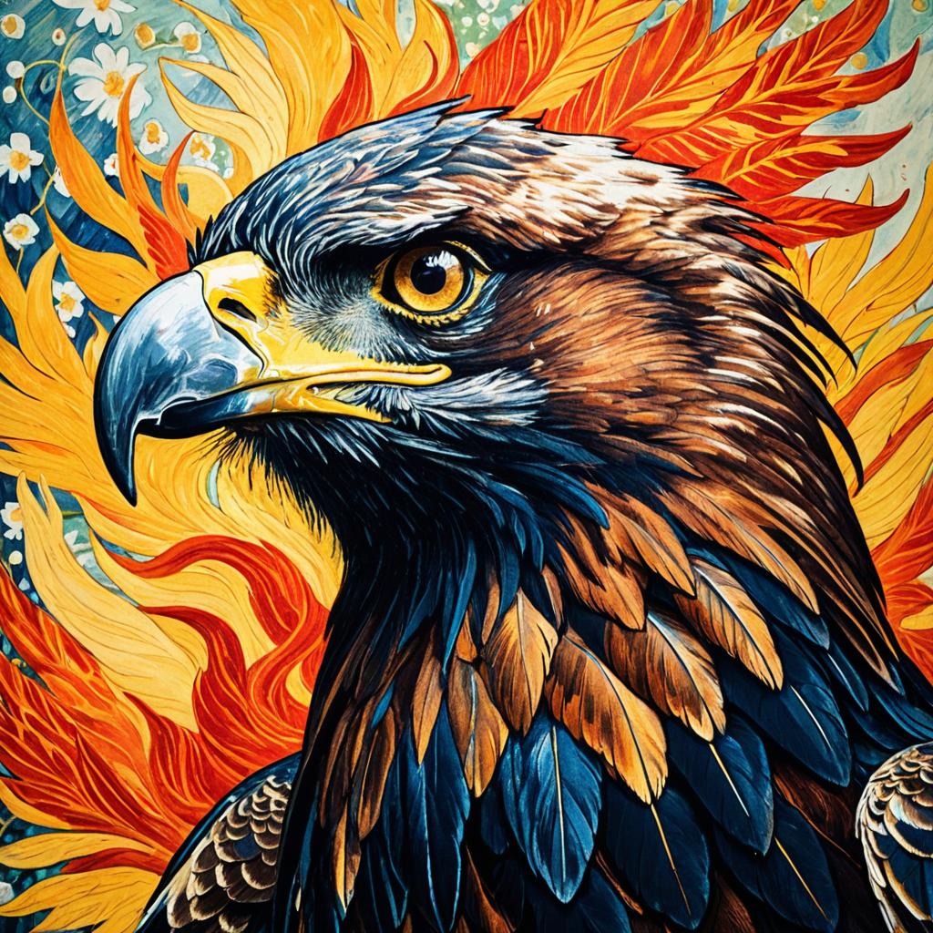 A hyper-detailed drawing of an eagle rendered in the Neo-Impressionist style, featuring vibrant and stylized fiery patterns in the background. The artwork combines influences of Henri Toulouse-Lautrec, Mary Cassatt, and Camille Pissarro, showcasing detailed feathers with rich brown, blue, and golden hues, and a striking yellow beak and eye.