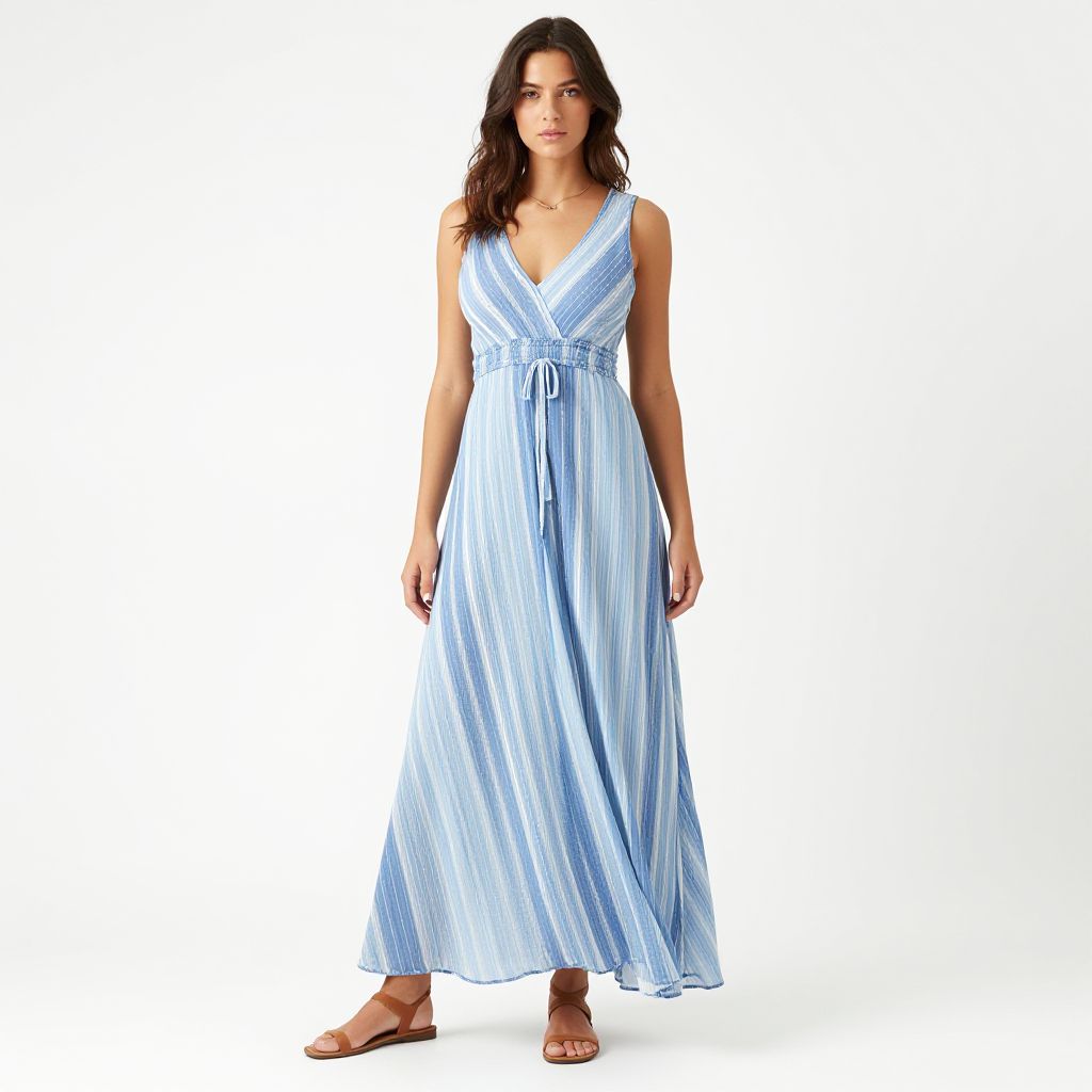 "Woman, boho chic, sleeveless maxi dress with diagonal stripes in shades of blue and white, V-neckline, gathered waist with tie detail, full flowing skirt, brown strappy flat sandals, minimal jewelry, natural wavy hairstyle, plain white studio background.. Sexy. Pretty face and beаutiful eyes. Big breasts."