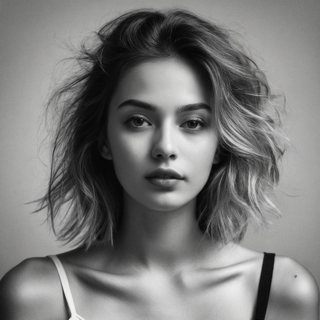Black and white photorealistic portrait of a young woman with messy, shoulder-length hair. She has a neutral expression with closed mouth, natural eyelashes, and bare shoulders visible. The simple background emphasizes her face and features.