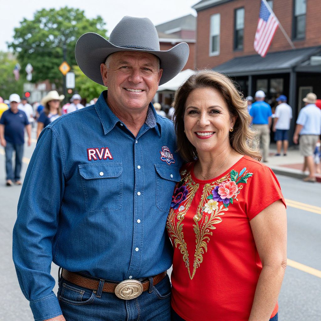 Smiling couple poses together at Westport's Memorial Day Parade, with the man wearing a gray cowboy hat and a blue shirt featuring an \"RVA\" logo, while the woman dons a vibrant red top adorned with floral patterns and gold embellishments, surrounded by a lively street scene.