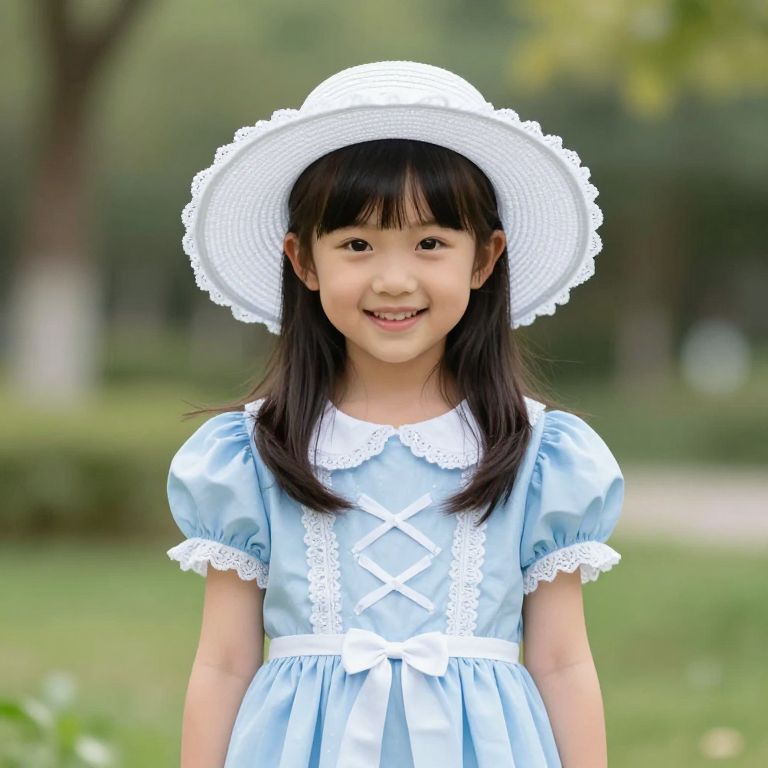 Photograph of a smiling Asian girl with long black hair, wearing a light blue dress with white lace and a white sunhat, standing in a green