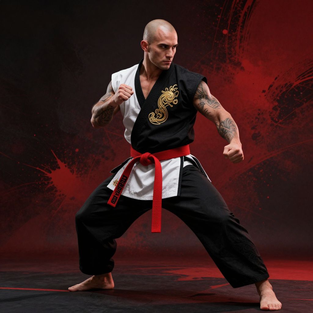 The image depicts a highly detailed and dynamic scene of a martial artist in action. The central figure is a muscular man with a bald head, wearing a traditional black and white karate uniform with a red sash tied around his waist. His attire is adorned with intricate gold designs, adding a touch of elegance to his outfit. The man's arms are tattooed, with visible designs on his biceps and forearms, suggesting a deep connection to martial arts. He is in a fighting stance, with fists clenched and knees bent, ready to strike. The background is a mix of dark and red hues, with splashes of paint that give the image a gritty, intense atmosphere. The overall composition is balanced, with the martial artist positioned centrally, drawing the viewer's attention to his powerful presence and the dynamic energy of the scene.