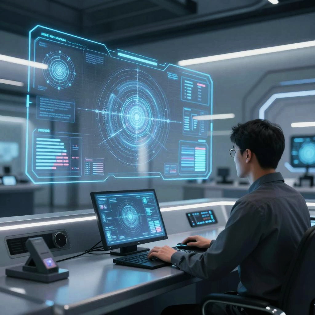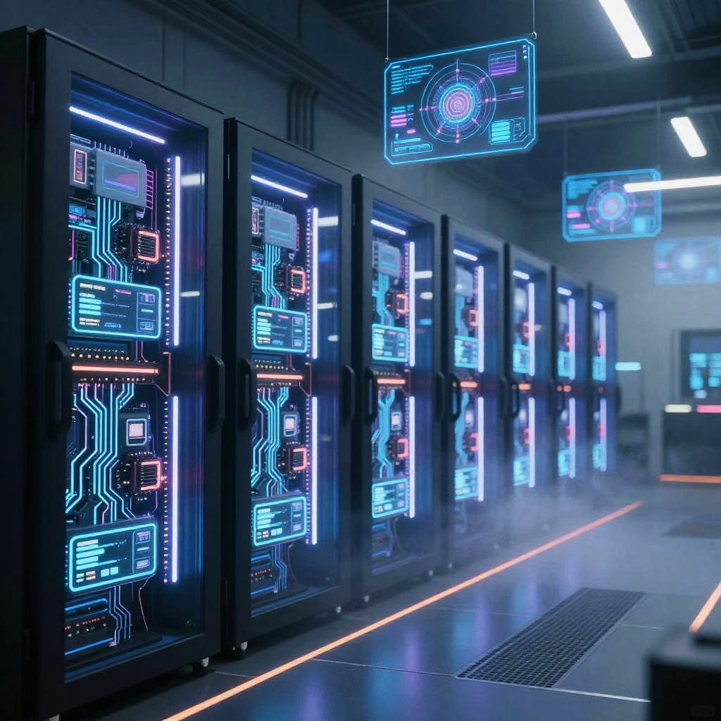 Sdxl 1.5 futuristic server room, rows of glowing machines with neon accents, sci-fi cybernetic atmosphere with mist and holograms, detailed nano circuits shown on transparent screens, cinematic lighting