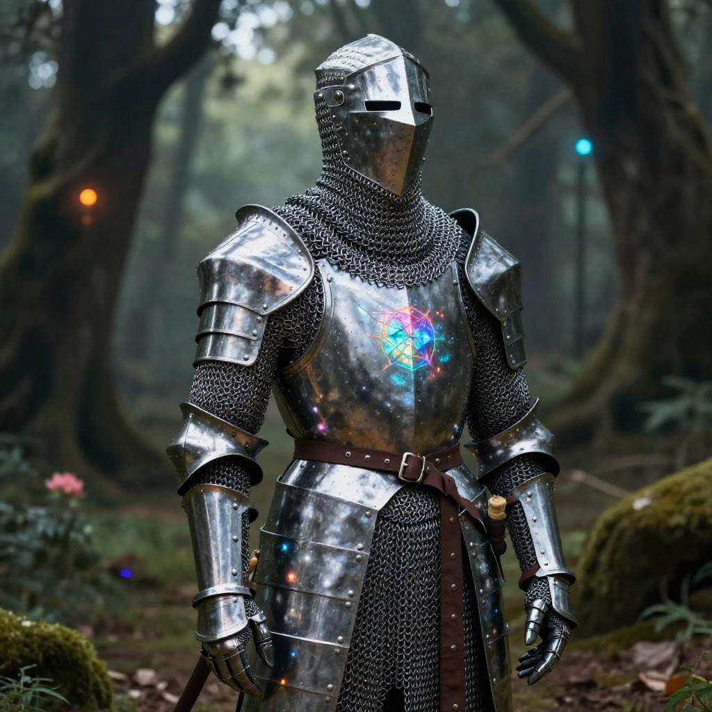 DND chainmail armor, elven ranger adorned in lightweight silver chainmail, mystical forest background, enchanted glow on armor, vibrant colors, fantasy realism