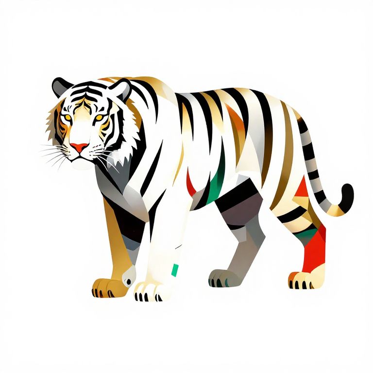 Hologram abstract modern minimalistic geometric 2d cyberpunk tiger in white black gold scarlet-red green,