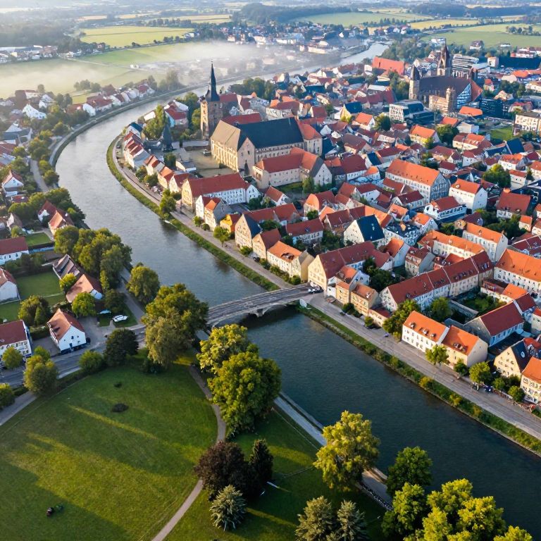 Aerial view of Landshut city with historic architecture, winding Isar river flowing through, lush green parks, fields surrounding city, morning mist over rooftops, vibrant colors, high detail, photorealistic style, European countryside ambiance
