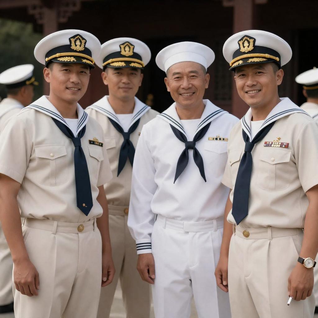 Photograph of four male naval officers in uniform, three in beige naval attire with dark ties and hats, one in a white sailor suit with a black tie and hat. They are smiling and standing close together, with one officer on the right holding a cigarette. Background includes other officers and a wooden structure.