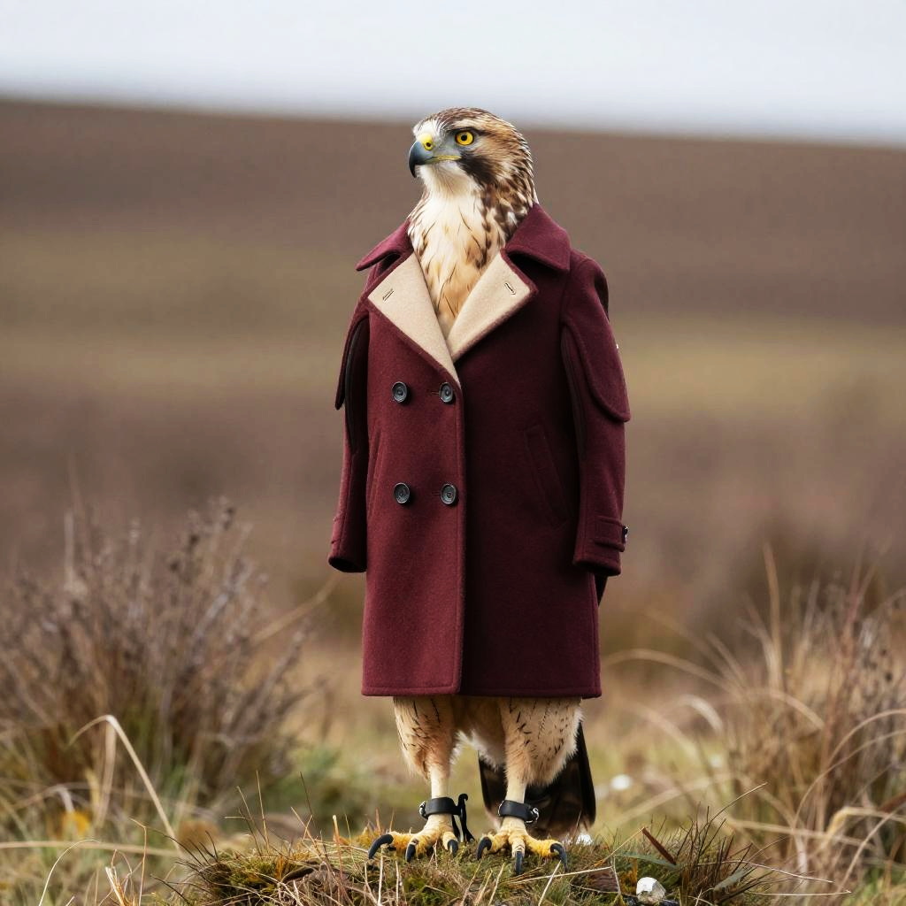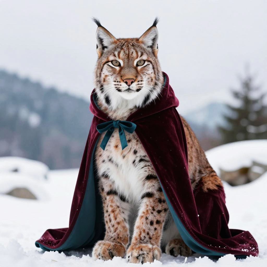 Elegant portrait of an lynx in a velvet cloak with colors burgundy and teal against a snowy mountain background, showcasing its regal presence.