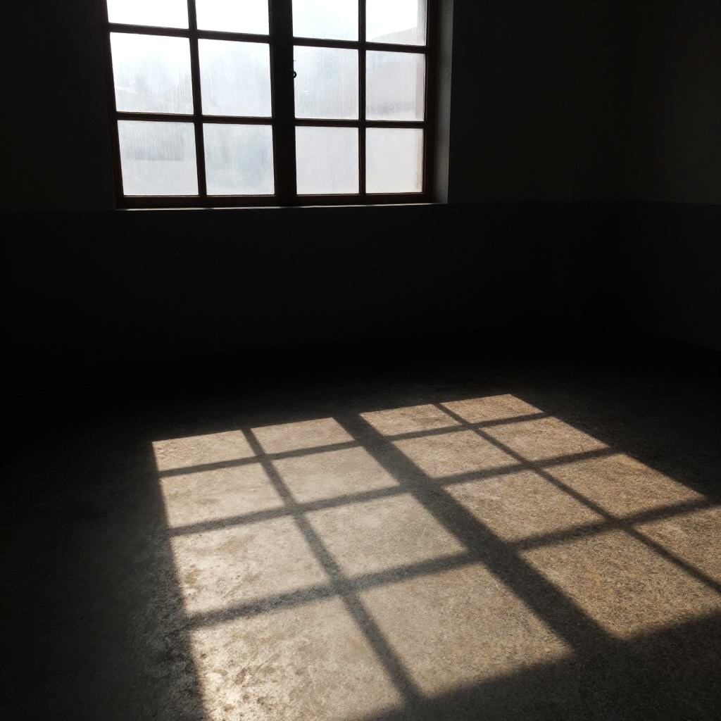 A photograph of a dark room with a large window casting dramatic shadows on the floor. The window is divided into small panes, with bright, warm sunlight streaming through, creating a grid of light and dark squares on the floor. The scene is mostly shadowy, with the sunlight providing a striking contrast. The floor has a textured, speckled pattern.
