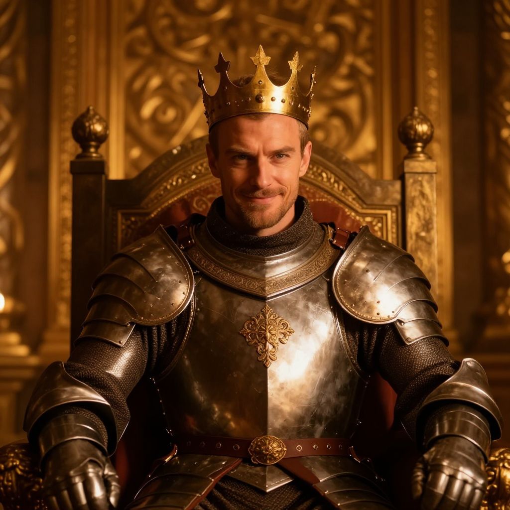 Smug smirk of a confident king in medieval armor, rich throne room, intricate patterns, warm golden tones, dramatic shadows, royal portrait style
