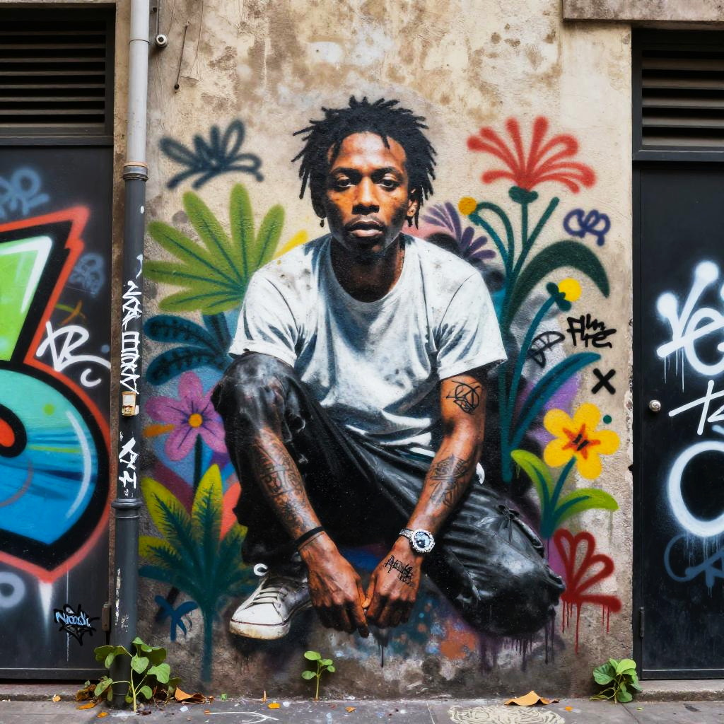 Realistic photo.gritty street artist with graffiti tattoos and urban flora, colorful and cinematic style by Banksy, Shepard Fairey, Jean-Michel Basquiat. realistic photo