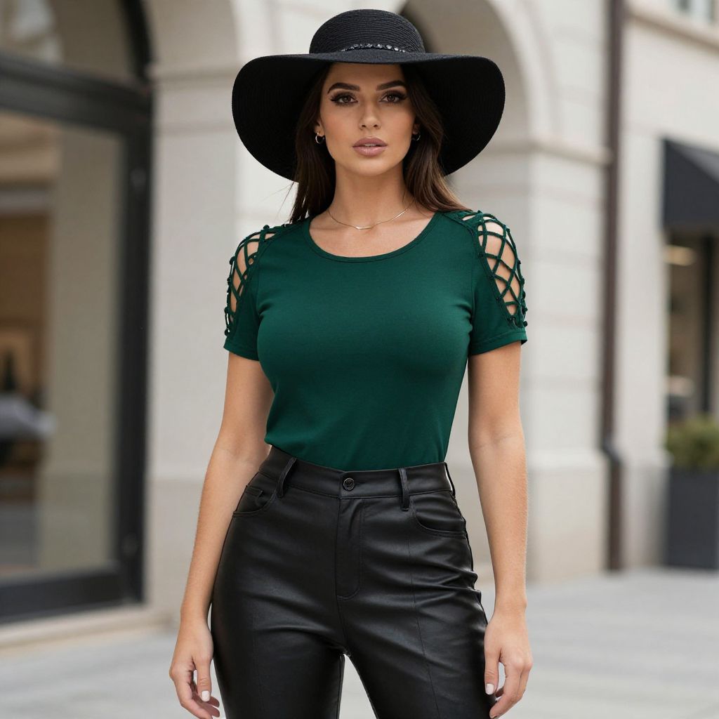 Photograph of a stylish woman standing on a city street. She has long dark brown hair, wearing a black wide-brimmed hat and a dark green, short-sleeved top with intricate lattice cut-outs on the shoulders. She pairs this with high-waisted black leather pants. Her makeup is subtle, with dark eyeliner and nude lipstick. She wears small gold earrings and a delicate gold necklace. The background features a blurred, sunlit urban setting with white stone buildings and black-framed windows, suggesting a fashionable city environment. Her confident pose and chic outfit exude a modern, sophisticated look.