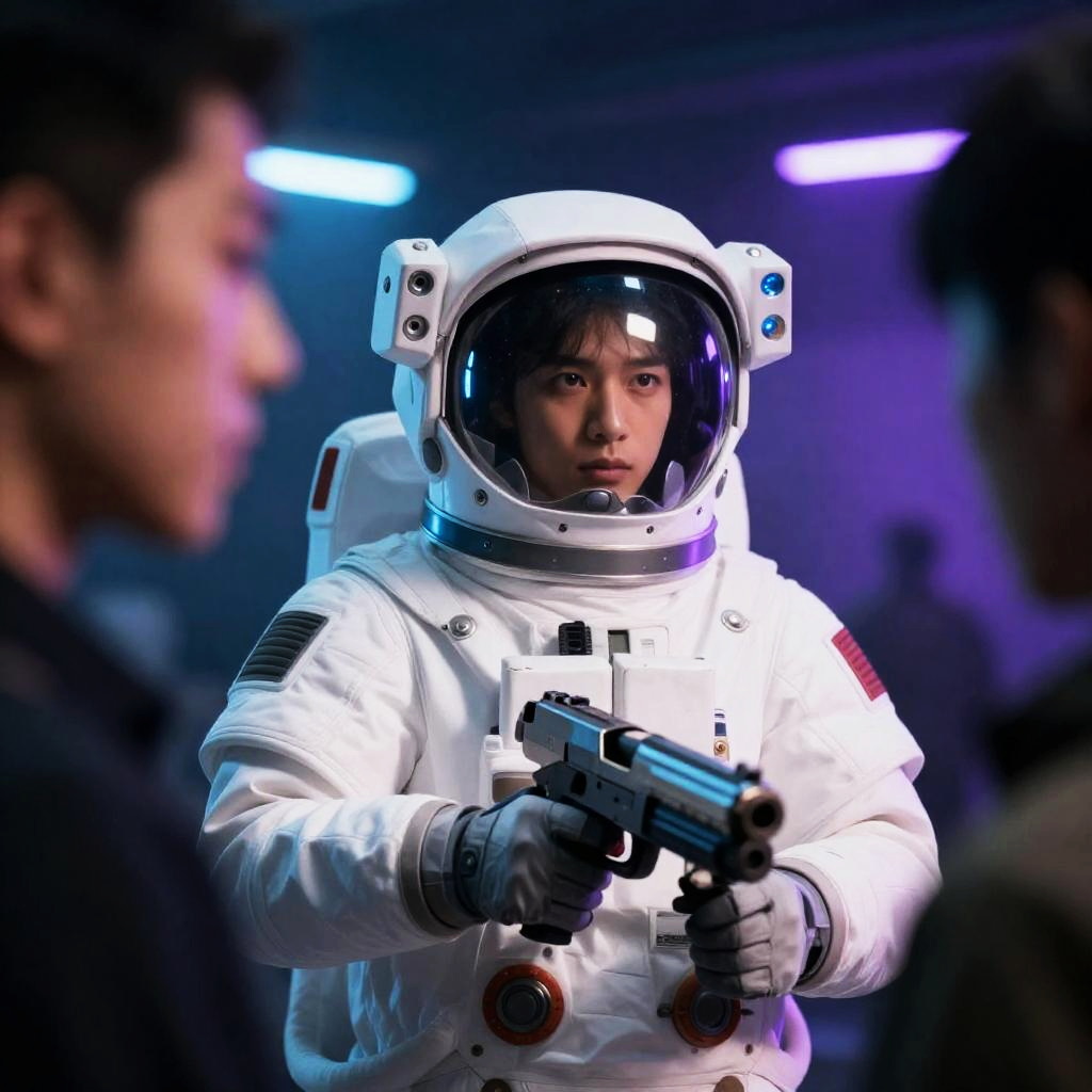 A man in a white astronaut helmet with blue lights, holding a futuristic gun, has a focused expression. Background features blue and purple lights. Another person's blurry face is on the left. Indoor setting. Two people.
